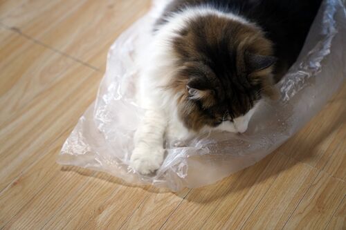 まずは、いつもの阪急さんの袋ですが。 今週は配達がないので古い袋しかありません。でも大丈夫、霧吹きで水滴をしゅっと付けてあげるとすぐに飛び乗ってきます。袋の上をごろごろと転がったり、ぺろぺろと水滴を舐めたり。楽しそうですね。 どうですかどう…