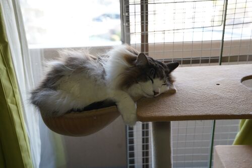 今日は雨模様。ハンモックであんにゅいなOちゃんです。 朝、ベランダにはいちおう出たものの。猫草を何本かちぎってあげた後はすぐに部屋に戻って食っちゃ寝、食っちゃ寝。 それじゃあちょいと運動がてら遊んでもらいましょうか。 今日のおもちゃはごむひも…