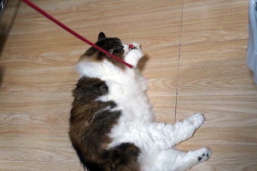 今日のOちゃんと遊ぼうは、久しぶりの赤い紐ひもですよ。 紅い紐ひもはいつでも遊べるようにラックの上からひもが下りてくるようになっております。BGMはサンダーバード出撃。 ちゃっちゃららー♪ 降りてきた紐ひもをすかさずキャッチしてお口でくわえます。…