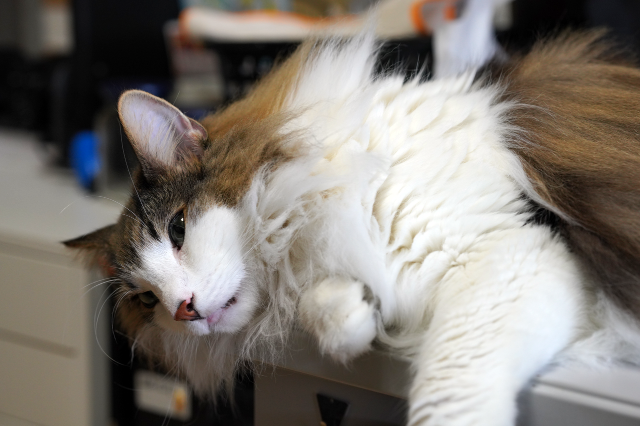 ごはんをねだるでもなし、遊んでほしいということでもなし。ただただあんにゅいにコロコロする邪魔っ子です。眠たくなったらそのままひとやすみ。おなかがすいたらカリカリを食べに行きます。要するに暇なので誰かの近くで様子を見ながらころころしているようです。こちらも様子を見ながらブラシをかけてみたり、爪を切って見たり。そういうあんにゅいな時間。