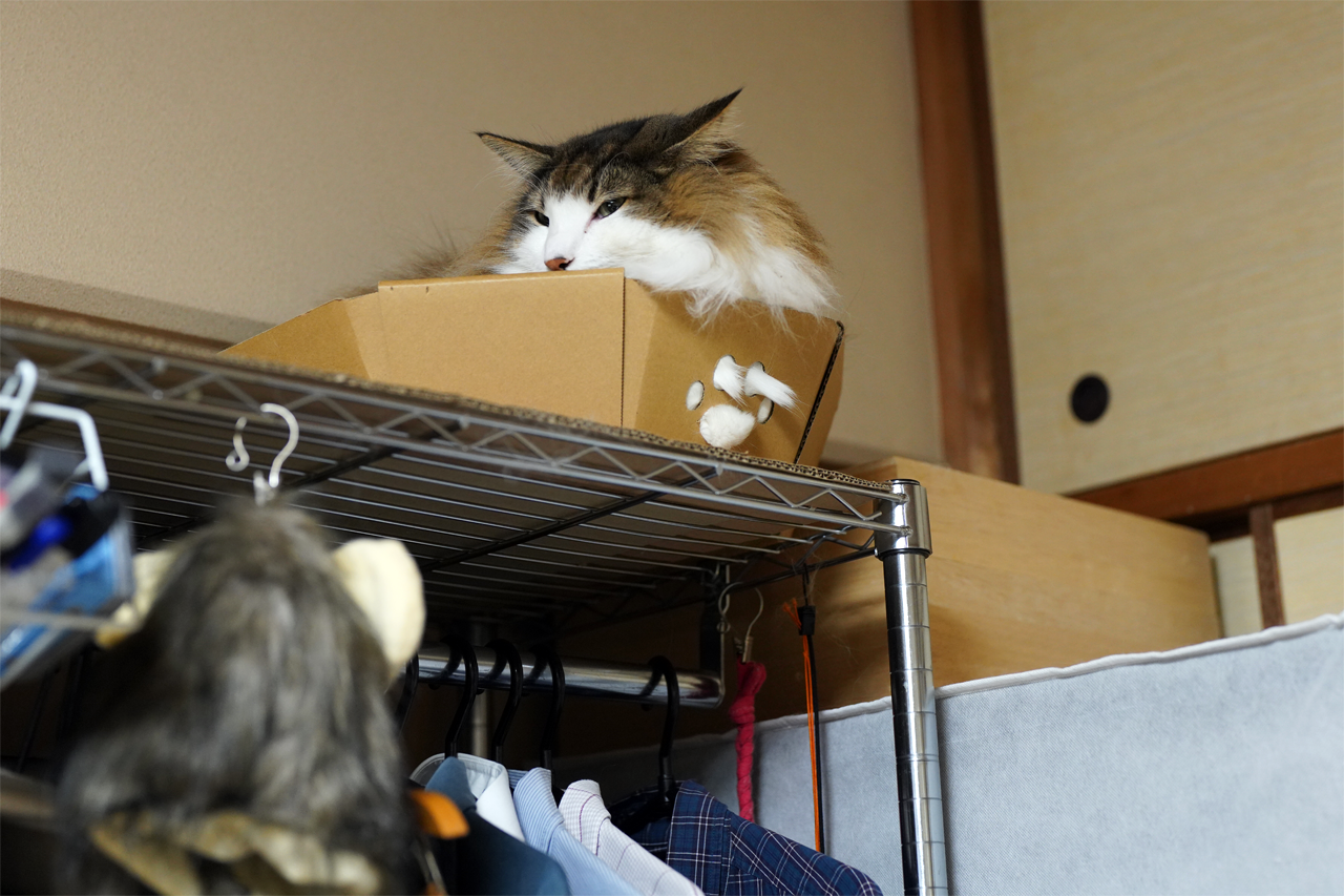 いつものように衣装ラックの上に置いたにゃんこ鍋でくつろぐO次郎。