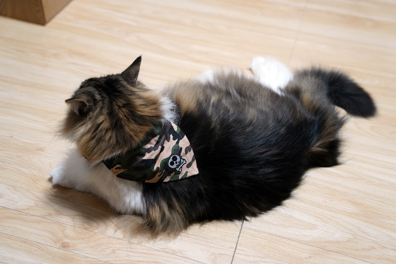 この人、頭にかぶるものは嫌がりますが。首に巻くものはあまり気にしません。エリザベスカラーも三日目からは平気で走り回ったりしていました。ただし、あまり長時間付けると首周りの毛がだまだまになっちゃうので首輪とかは付けられません。