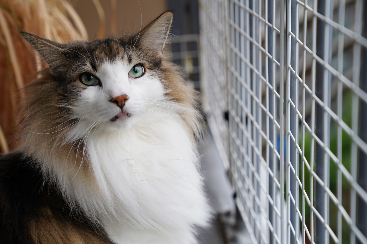 さっそくベランダに出たO次郎ですが。なにかを見つけて急に東側の猫草のところへ駆け寄りましたよ。ベランダの溝でなにか見つけたようです。