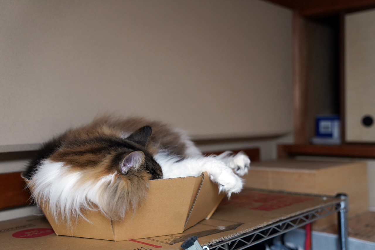 今日は天袋前のにゃんこ鍋でぐっすりですね。天井近くは暖房のあたたかい風が心地良いようで。天袋や、ねこテントにも入っています。
