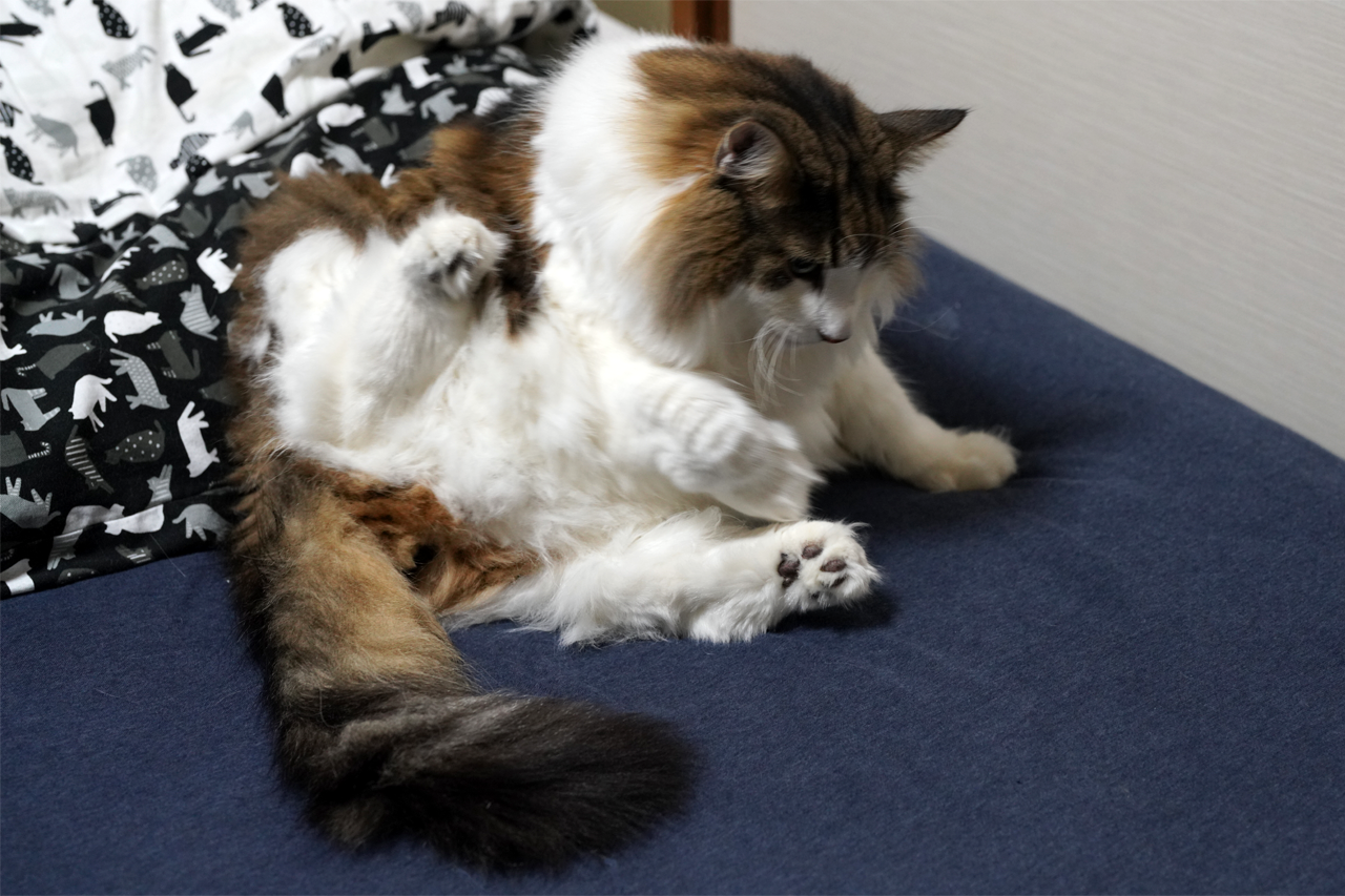 おなかの毛からしっぽこまで丹念にぺろぺろ舐めています。